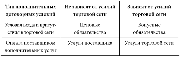 Характерно, что две группы дополнительных договорных условий (ценовые и бонусные обязательства) связаны с условиями входа поставщика в сеть и условиями его присутствия в этой сети, а две оставшиеся группы — с оплатой поставщиком дополнительных услуг (своих и оказываемых сетью) по продвижению и реализации товара. В свою очередь, две группы дополнительных условий из четырёх зависят от усилий розничной сети (бонусные обязательства и оплата услуг сети), а ещё две группы дополнительных условий (ценовые обязательства и оплата услуг поставщика) от них напрямую не зависят (см. табл. 4.1).