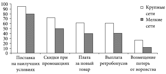 Не наблюдается особых различий в частоте ценовых обязательств и в отношении типов поставщиков. Единственное исключение касается практики крупных сетей, которые чаще применяют условие гарантирования размера маржинального дохода, и производителям оно предъявляется чаще, чем посредникам (р ‹ 0,05).