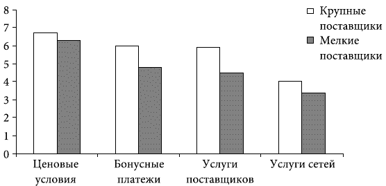 Наконец, оплата дополнительных услуг, предоставляемых розничной сетью, практически не зависит от размера, типа поставщиков и происхождения товара. Речь идёт лишь об отдельных исключениях в практике работы крупных сетей: о более частых практиках оплаты их услуг по размещению рекламы товара в средствах массовой информации крупными поставщиками (по сравнению с мелкими) (р ‹ 0,01), и о более частых требованиях к производителям (по сравнению с дистрибьюторами) оплачивать рекламные изображения своего товара в рекламном издании торговой сети (р ‹ 0,05). Когда же переходим к мелким сетям, то значимые различия исчезают вовсе [56].