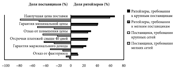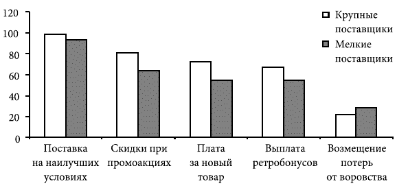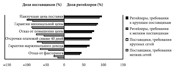 полученной картины [57].Ещё более удивительным кажется то, что нередко розничные сети оценивают частоту распространения тех или иных условий, применяемых в договорах с поставщиками, не ниже, а выше, чем сами поставщики. Особенно это касается мелких и средних розничных сетей. Возможно, представители этих сетей несколько переоценивают уровень своих требований по сравнению с тем, что они реально могут себе позволить в деле субординации поставщиков.