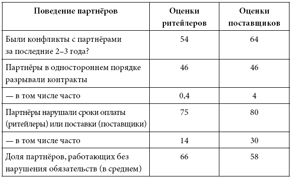 Сходная ситуация проявляется и в ответе на вопрос: «Какова примерная доля контрагентов, сотрудничающих с Вашей компанией, не нарушая обязательств?» Здесь представители ритейла в среднем указали на две трети поставщиков (66 %), а у поставщиков эта цифра оказалась меньше — 58 % (различие значимо на уровне 0,05). Если верить полученным ответам, среди поставщиков договорную дисциплину нарушает каждый третий, а среди ритейлеров — более 40 % (см. табл. 4.2).