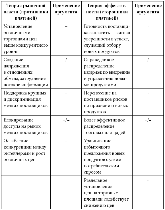Продолжим тему обоснования позиций, обратившись к специальной литературе, где излагаются результаты исследований в отношении бонусных платежей, которые сегодня, как мы уже установили, воспринимаются наиболее болезненно. Плата и скидки за место на магазинных полках в развитых странах возникли как системное явление относительно недавно, в середине 1980-х гг. До сих пор даже в более развитых странах по их поводу не выработана окончательная судебная практика, и сама экономическая обоснованность их применения является объектом дискуссий. В них сталкиваются аргументы теории рыночной власти (точнее можно было бы сказать «злоупотребления рыночной