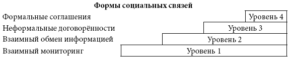 С этой точки зрения, представленные в нашей классификации типы социальных связей выражают разные степени, или разные градации укоренённости. В результате мы получаем своего рода лестницу, каждая последующая ступень которой ведёт к установлению более сильной социальной связи и тем самым к более высокому уровню социальной укоренённости совершаемых действий. Первый уровень (взаимный мониторинг действий конкурентов) означает, что фирмы, собирая рыночные сигналы, начинают строить социальные связи как альтернативу атомизированным действиям. Но эти связи ещё имеют безличный характер.