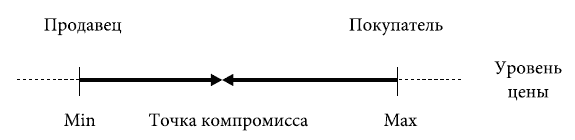 Как заключается сделка между продавцом и покупателем, каждый из которых преследует собственные экономические интересы и стремится к их максимально полному удовлетворению? Она становится возможной благодаря компромиссу, когда стороны вынуждены отказаться от максимально полной реализации своего интереса для того, чтобы он был реализован в принципе. Этот компромисс достигается в немалой степени в процессе торга, в рамках которого контрагенты пытаются предложить (или навязать) друг другу собственное понимание эффективных и справедливых условий обмена. Исходная модель торга может быть представлена в виде континуума с противоположно направленными интересами, а точка, в которой достигается соглашение сторон, определяется их относительной договорной способностью как непосредственным выражением рыночной власти, или способностью создать для себя лучшие условия обмена, заставив партнёра пойти на уступки, не отказываясь от обмена. Существуют также границы континуума, за которые участники заключаемого контракта отступать не готовы, своего рода край: за его пределами обмен перестаёт быть выгодным по представлению одной из сторон, и она готова от него отказаться. Таким образом, в первом приближении торг выглядит как лобовое столкновение сторон, преследующих сходный интерес и борющихся до тех пор, пока одна из них (доминируемая) не достигнет последней черты, за которую она уже не готова более отступать, а другая (доминирующая) не исчерпает свою способность к давлению (см. рис. 1.1).