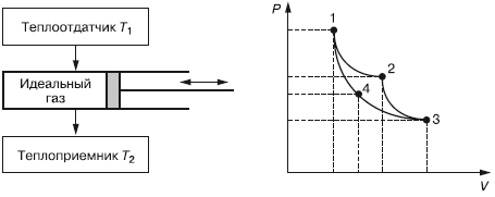 В точке 2 цилиндр полностью изолируется от внешней среды (теплообмена нет) и при дальнейшем движении поршня вправо уменьшение давления и увеличение объема происходит по кривой 2–3, которая называется адиабатой (процесс без теплообмена с внешней средой). Когда поршень переместится в крайнее правое положение (точка 3), процесс расширения закончится и параметры будут иметь значения Р3, V3, а температура станет равной температуре теплоприемника Т2. При этом положении поршня изоляция рабочего тела снижается и оно взаимодействует с теплоприемником. Если теперь увеличивать давление на поршень, то он будет перемещаться влево при неизменной температуре Т2 (сжатие). Значит, этот процесс сжатия будет изотермическим.