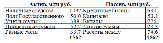 Если устранить из приведенного баланса кредитные билеты, выпущенные в обращение, которые являются обязательством банка лишь в том смысле, что банк обязан производить по ним размен, то оказывается, что главные средства банка составляют вклады — 776 млн и его капитал — 53 млн рублей, причем из этих средств на разные ссуды обращено 389 млн рублей; остальные же суммы имеются в наличности главным образом в золоте.