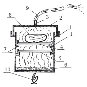 Рис. 2. Коптильня в квартире: 1 – корпус коптильни; 2 – крышка; 3 – трубка для выхода дыма; 4 – решетка; 5 – лоток для сбора жира; [6] – опилки; [7] – -образные бортики под решетку и лоток для сбора жира; [8] – изделия для копчения; [9] – гибкий шланг для отвода дыма в форточку; [10] – источник огня; [11] – -образные бортики под крышку (для воды)