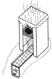 Плотно сколоченные ящики длиной и шириной по 1,5 м, высотой около 2 м накрываете мешковиной. Около ящика выкапываете канавку длиной около 1 м, которую накрываете жестью, а сверху укладываете еловые ветви и закладываете их дерном. В конце канавки оборудуйте топку. Продукты раскладываете на решетке. Затем разжигаете огонь и тут же засыпаете его опилками. Стружки или опилки должны тлеть непрерывно при достаточном доступе воздуха, выделяя светлый дым. Но следите, чтобы дрова при этом не горели! Если все делаете правильно и контролируете процесс, то дым от тлеющих опилок идет из канавки на разложенные в ящике продукты, а затем выходит через мешковину.