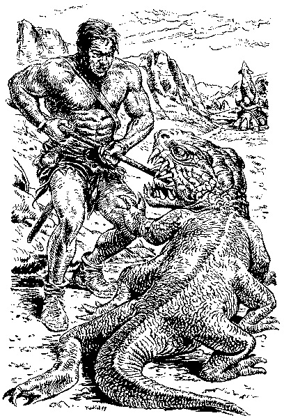 Тело зверя покрывала жесткая чешуя, из пасти торчали устрашающего вида зубы, лапы были украшены острыми когтями. Если не считать пары довольно уродливых сандалий, пошитых из мягкой части шкуры такого же зверя, только поменьше размером, и поношенного ремня с крючками для небольших мешочков, в которых хранилось необходимое снаряжение, человек был обнажен. Впрочем, за тридцать дней, проведенных на планете, он сумел адаптироваться к местным условиям и чувствовал себя без одежды совершенно естественно.
