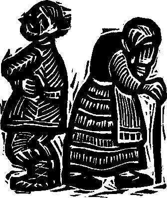 Старик повесил в сенях котелок и стал варить ужин. Старушка отщипнула кусочек масла и плюх в котелок. «Киш, окаянные, котелок мне загадите!» — выругал старик куриц, что на чердаке сидели. А старушка подождала немного и опять кинула в котелок кусочек масла. «Киш, сквернавки!» — опять выругал старик куриц. Старушка в третий раз кинула кусочек масла. Старик вышел из терпения, схватил палку и полез на чердак, приговаривая: «Вот как задам, как задам этим курицам, не будут они кидаться чем не следует!» Влез, глядит — а это старуха сидит, скорчившись, и дрожит в уголке. Пожалел старик старуху, повел ее в избу горячий ужин есть, и снова они зажили припеваючи.