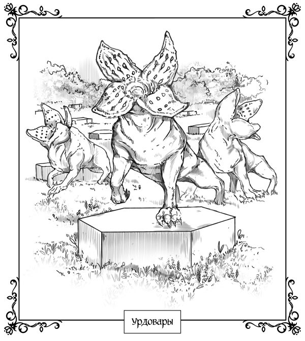 В зеленоватом сиянии осветительных ракет, медленно планирующих к земле, вставали над сугробами мрачные шестиугольные надгробия. А на них и между ними виднелись скользкие черные твари, похожие на бульдогов. Урдовары. Крупные, человеку по пояс, с широкой грудиной. Голова – одна сплошная четырехстворчатая пасть с зубьями-иглами в три ряда, задние лапы короткие, вывернутые – благодаря им твари прыгали далеко, отталкиваясь, как на пружинах. Пасти непрерывно раскрывались и закрывались, показывая черные сокращающиеся воронки из плоти – будто урдовары постоянно сглатывали. И воняло от них тухлятиной и ацетоном. Как, богам на милость, бороться с теми, кому неведомы боль и страх? Кто существует только ради уничтожения живого, ради поглощения горячей крови и мяса?