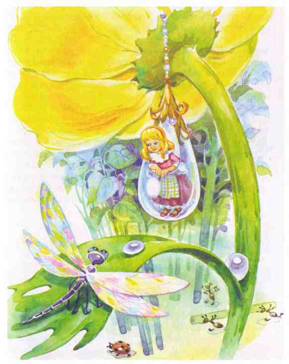 Лютик, лютик золотой, Ты ворота мне открой Именем Флоры В зелёные просторы.Едва я сказала эти слова, как почувствовала, что делаюсь всё меньше, меньше… И вдруг по стебельку ко мне спустился лифт! Я сначала приняла его за каплю росы. И я вошла в этот лифт. Выйдя из него, я очутилась в сверкающем зале, в конце его виднелись золотые ворота, я повернулась к ним и инстинктивно повторила: