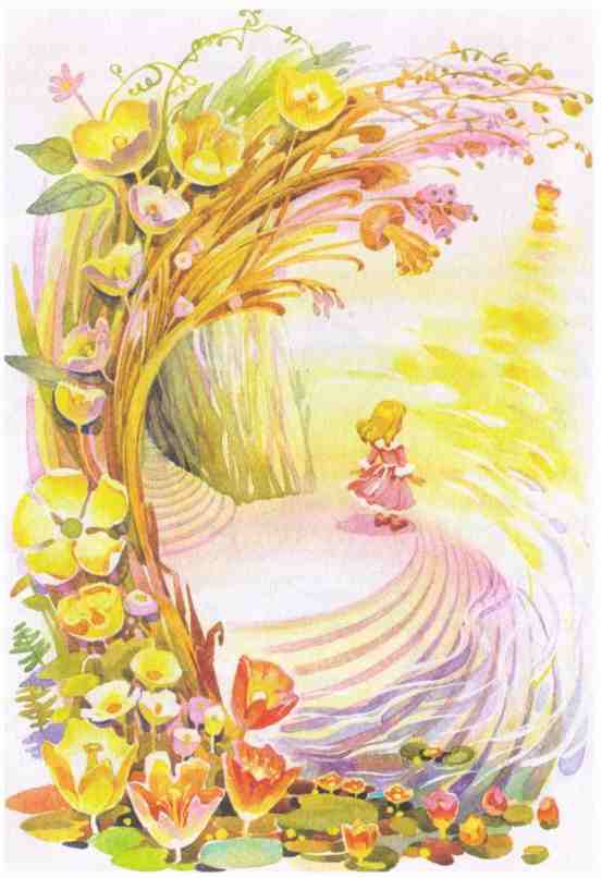 Лютик, лютик золотой, Ты ворота мне открой Именем Флоры В зелёные просторы.Ворота отворились, и за ними оказалась хрустальная лестница, такая длинная, что не видно было, где она кончается. Я стала спускаться, и ступеньки у меня под ногами звенели, как колокольчики. Я долго забавлялась, слушая эту тоненькую музыку, которая по моей воле то убыстрялась, то замедлялась, а когда я оглянулась назад, золотые ворота наверху лестницы превратились уже в крошечную сияющую точку. Передо мной, насколько хватал глаз, поднимались ступеньки, ступеньки, сплошные ступеньки, терявшиеся вдали.