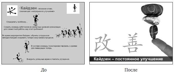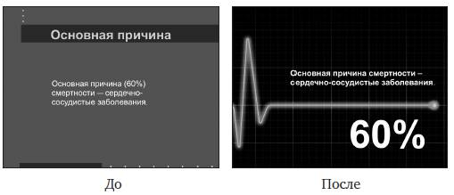 Вот некоторые примеры переработки слайдов, при создании которых были допущены типичные дизайнерские ошибки. Сравните «до» и «после» и оцените различия и их эффект.