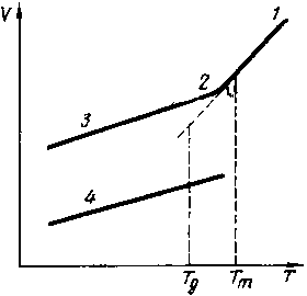 Рис. 12. Изменение объема жидкости с температурой в процессе варки стекла (Тm — температура кристаллизации; Тg— температура стеклования. 1 — расплав; 2 — переохлажденная жидкость; 3 — стекло; 4 — кристалл)
