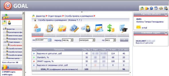 А внедрять сразу одновременно на 87 сотрудников, поверьте мне, требует очень много времени, сил. Со стороны менеджмента – ничем другим не занимаешься, как только разрабатываешь эти показатели деятельности для сотрудников. (Время осознания показателей и формирования матриц на 87 сотрудников 5—10 дней, включая обсуждение и согласование. Для это надо уметь оперировать понятиями «KPI-КАРТА», «универсальные» и «ближайшие» KPI. – Прим. компании «Целевое Управление»). Поэтому на сегодняшний день я считаю, что мы поступили правильно. На уровне служб отделов уже четко работает эта система. Все имеют представление о GOAL-технологии, и каждый менеджер пока отслеживает эту систему вручную. У каждого есть свои формы учета по каждому сотруднику. Оценка каждого происходит в ежедневном режиме, но все это вместе оформляется в рамках службы. Я считаю, что это правильно, потому что когда мы докупим и расширим систему до каждого отдельного сотрудника, все будут иметь общее представление о том, как система работает. Намного проще это будет внедрять, и объяснять тем же горничным и сотрудникам тех. службы, как GOAL– технология должна работать.
