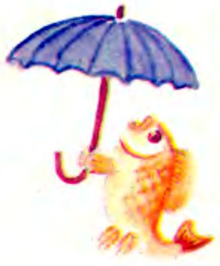 Вовку, Пати и Шурика определили в упаковочный цех. Они должны были наклеивать на картонные коробки наклейки: что здесь, в коробках, копчёная барабулька. Очень вкусная. Покупайте, пожалуйста. Вот она нарисована: золотая рыбка под зонтиком. Эмблема завода.