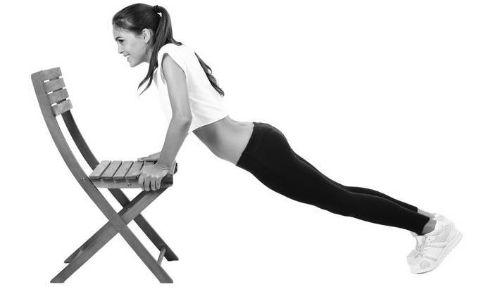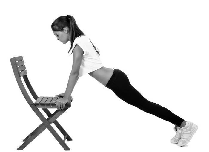 Упритесь руками в сиденье стула. Примите положение «упор лежа» и отжимайтесь, поднимая верхнюю часть корпуса силой мышц рук и не двигая тазом. Это упражнение укрепляет мышцы рук и груди.
