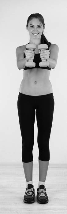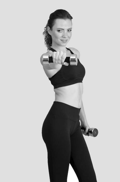 Возьмите гантели. Основное упражнение этого комплекса – разведение рук в стороны с дополнительным весом. Вытяните руки перед собой, а затем начинайте разводить руки в стороны.