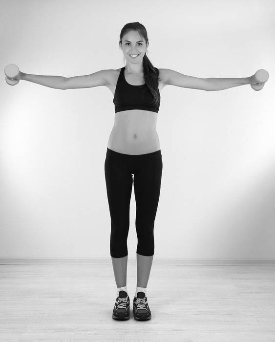 Встаньте прямо. Руки с гантелями опустите вниз – вы расслаблены. Теперь поднимаем прямые руки на высоту плеч через стороны – от корпуса вверх. Повторите по 10 раз для каждой руки.