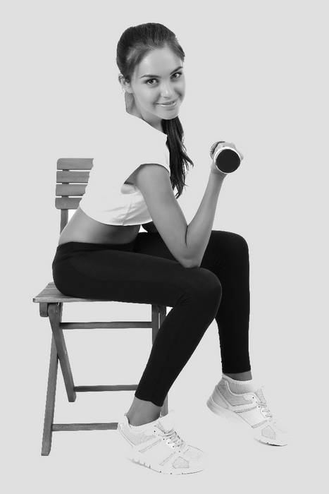 Сядьте на стул. Поставите ноги прямо, согнув колени под прямым углом. Возьмите гантель в руку, согнутую в локте, при этом локтем вы должны упираться в колено. Сгибайте и разгибайте руку, работая при этом не только бицепсами, но также мышцами груди. Это упражнение позволяет сделать грудные мышцы более сильными и выносливыми, что важно для красоты нашей груди.