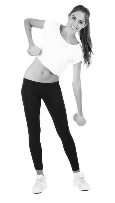 Взяв гантели в две руки, выполняйте легкие наклоны корпуса. При этом поочередно подтягивая вверх правую и левую руки. Поясним: наклоняясь