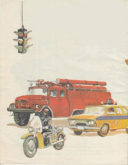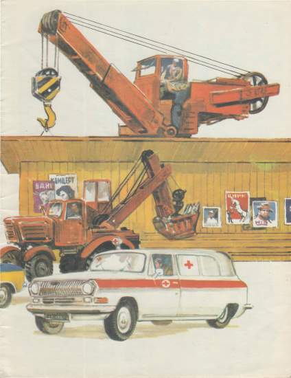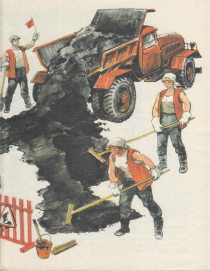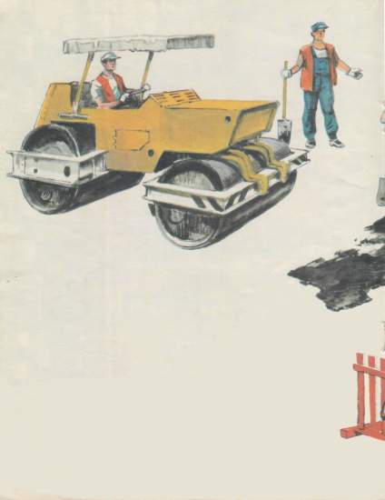 спешите! Сперва поезд пройдет — потом ваша очередь“.А вот ремонтируют шоссе. Рабочие в ярких оранжевых жилетах. И машины у них яркие-яркие. Красный бульдозер разравнивает землю, жёлтый асфальтоукладчик укладывает дымящийся асфальт, оранжевый каток-великан, как утюгом, его разглаживает. „Вот мы где! Вот мы где! — предупреждают своим цветом дорожные машины. — Объезжайте нас! Снижайте скорость!“