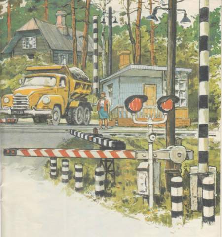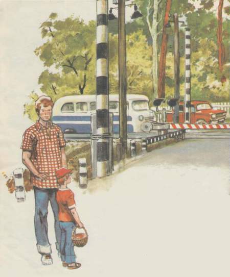 — Так ведь железнодорожный переезд — опасное место, — отвечает папа. — Как же его не сделать позаметнее? Мигают красные огоньки, великанская рука шлагбаума так и пестрит своими полосками. „Вот я где! Вот я где! — сигналит всем автомобилям, всем прохожим железнодорожный переезд. — Погодите, не