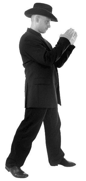 Из положения боевой позиции вес тела перенесите на правую ногу. Разверните туловище примерно на 90°. Одновременно поднимите вверх-вперед бедро левой ноги. Из этого исходного положения выполните ударное движение активным разгибанием бедра левой ноги. Удар наносится пяткой стопы левой ноги. Верните ногу в исходное положение по траектории удара и примите боевую позицию.
