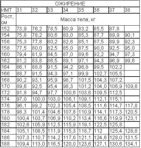– об ожирении 3-й степени – 36,0 – 40,9;
