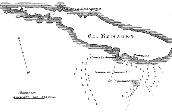 Однако одного «Кроншлота» для обороны фарватера было недостаточно, и на южном берегу Котлина в 1704 г. построили земляную временную батарею. Названная Старой (позднее – Андреевской), она размещалась напротив форта «Кроншлот». На западной оконечности острова, на том месте, которое мы сейчас называем рифом косы, и на самой Котлинской косе, размещался полк полковника Толбухина, в задачу которого входили наблюдение за Финским заливом и оборона острова при высадке неприятельского десанта.
