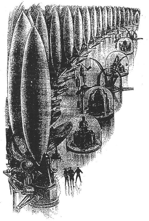 веретенообразных колонн. Весь овал зала охватывался ими, как кольцом. Но колонны не подпирали высокого свода, а бесшумно вращались на оси. Они, как будто, равномеренно и чинно плыли в неведомом танце. В промежутках между колоннами тоже бесшумно, но с неуловимой быстротой, вращались неясные металлические тела золотистого блеска. Своим стремительным движением они как бы пытались разогнать неторопливый, торжественный ход гигантов. Кроме того в зале вращалось и двигалось в различных направлениях множество дисков, цилиндров, конусов, осей, расположенных в строгой симметрии. Посредине зала, из одного края в другой, шел длинный ряд каких-то загадочных механизмов. Каждый механизм был заключен в прозрачный колпак.Все трое стояли посредине фантастического овального зала необозримой величины, переполненного изумительно двигавшимися колоннами и загадочными механизмами…