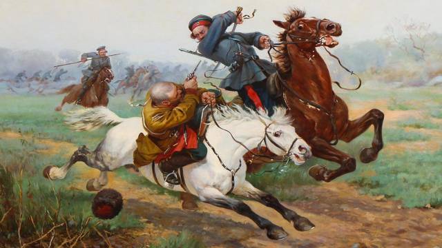 В это мгновение железная стена казачьей кавалерии, выставила вперед заряженные ружья и перейдя с быстрой рыси в стремительный галоп, горным селевым потоком помчалась на лагерь.