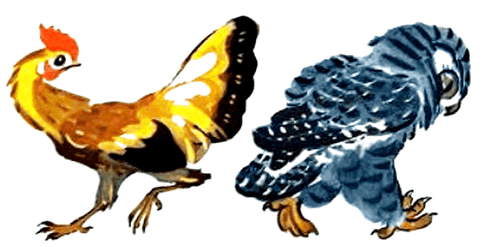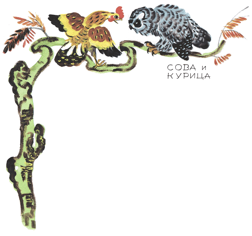 — Ах, курица, — сказала сова, — я слышу тебя, но я тебя не вижу. Где ты? Почему ты пришла в такое время? Приходи ночью, когда я хорошо вижу.