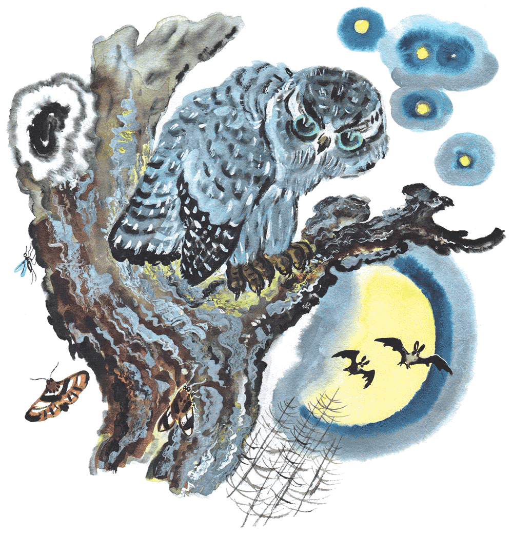 «Она меня не видит, — подумала сова, — это плохо. Что это у неё за глаза, которые ничего в темноте не видят? Ну-ка посмотрю».