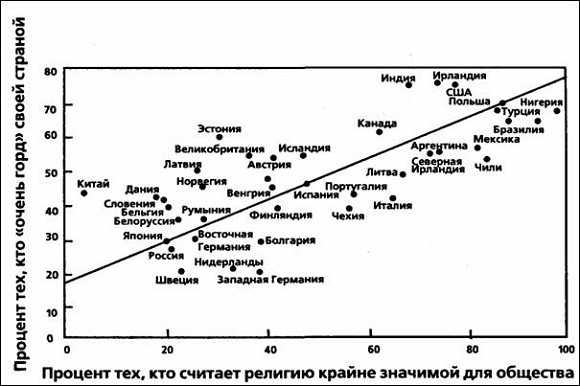 В истории Запада религия и национализм изначально шли рука об руку. Как показал Адриан Гастингс, первая часто определяла содержание второго. «Всякий народ определяет себя через религию не в меньшей степени, чем через язык... В Европе христианство привело к возникновению национальных государств»601 . В конце двадцатого столетия национализм ничуть не утратил своей связи с религией. Наиболее религиозные страны, как правило, оказываются наиболее националистическими. В ходе сравнительного анализа сорока одной страны было установлено, что общества, население которых признает значимость религии в человеческой жизни, являются одновременно и теми, население которых в наибольшей степени гордится своей страной (см. рис. 5)602.
