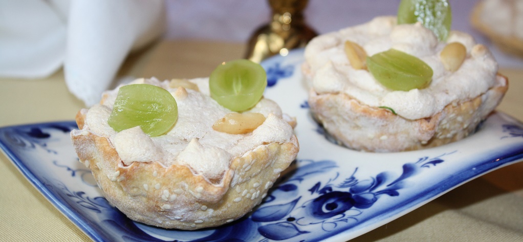 4 готовые тарталетки с посыпкой из кунжута (рецепт приведен в книгах данной серии), 200 гр свежих яблок, 1 яичный белок, 1 столовая ложка сахарной пудры, 100 гр винограда, несколько очищенных орехов.