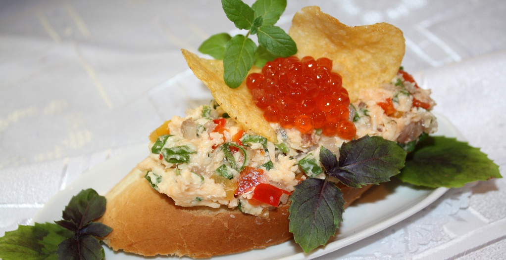 Около 400 гр багета, по 100 гр сливочного масла, мягкого козьего сыра и балтийских маринованных килек, 50 гр маринованного красного перца, 1-2 стебля