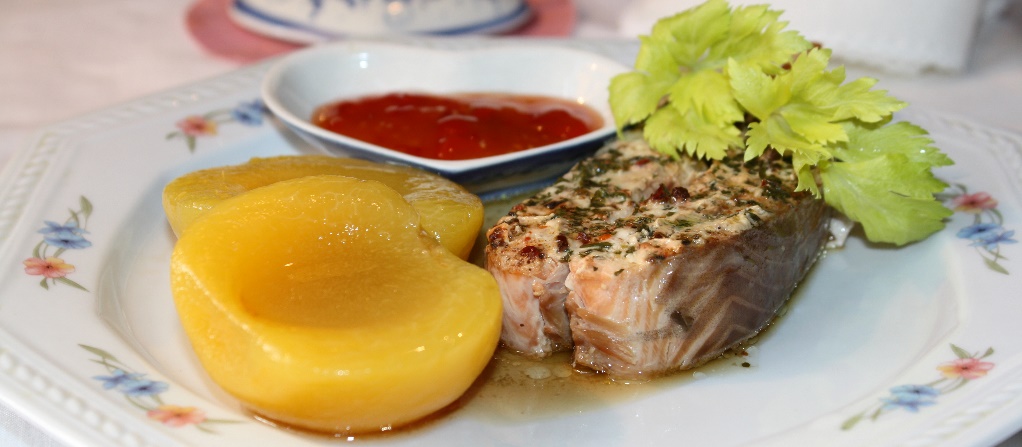 Рыбу разложить в порционные тарелки, полить соусом, в котором она запекалась. Гарнировать рыбу персиками, оформить зеленью сельдерея. Вишневый соус подать отдельно, в маленьких соусниках.