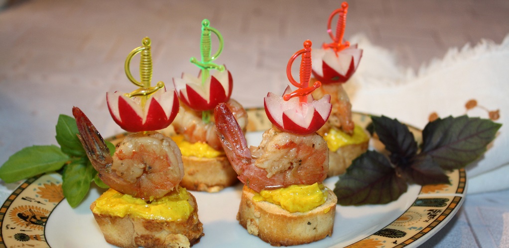 10-15 готовых тарталеток из сырной (любой другой) булочки, 50 гр готовой пасты для приготовления бутербродов из сливочного масла и сыра, 100-150 гр отварных, замороженных креветок, пучок редиски, по 1 столовой ложке топленого масла, соевого соуса, сока лимона и красного сиропа, по щепотке молотого имбиря и перца чили, 1 чайная ложка сушеной зелени базилика, морская соль и сахар по вкусу, листики пряной зелени.