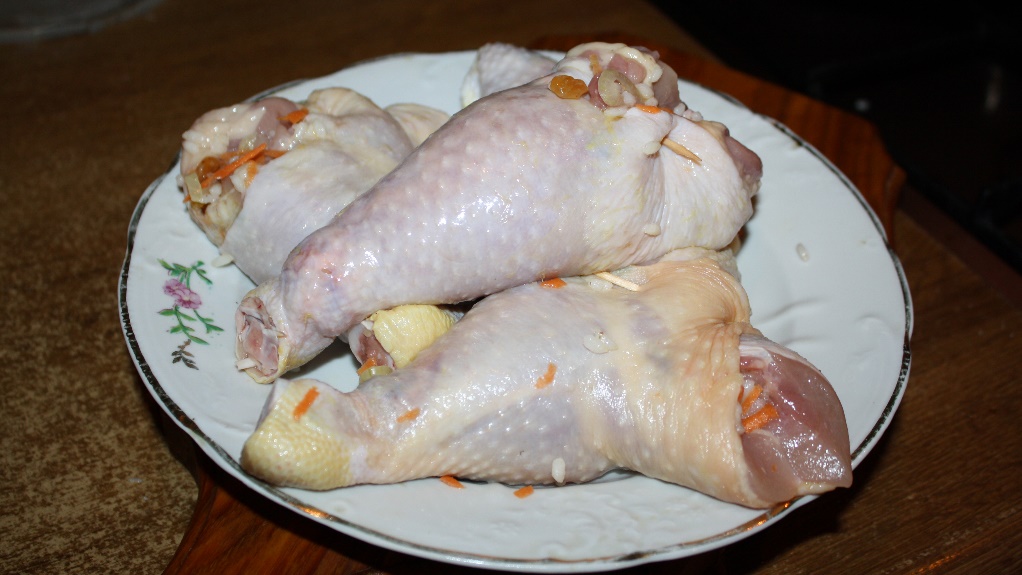 Смешать грибы, морковь, сыр, лук, чеснок, топленое масло, рис, изюм, посолить, приправить перцем. Начинить ножки приготовленным фаршем, разрезы сколоть шпажками. Уложить ножки в низкий сотейник, залить бульоном, тушить на медленном огне около 40 минут.