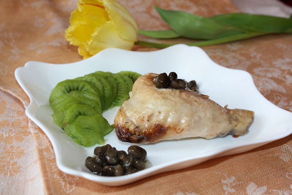 Ножки обмыть, обсушить, извлечь косточку (создать закрытый с одной стороны карман, для чего косточку возле сустава надрубить и ее часть около 1,5 см оставить). Внутри ножки мясо посолить и приправить перцем. Вешенки опустить в кипящую подсоленную и подкисленную воду, бланшировать 2-3 минуты, откинуть на сито, обсушить, нарезать соломкой.