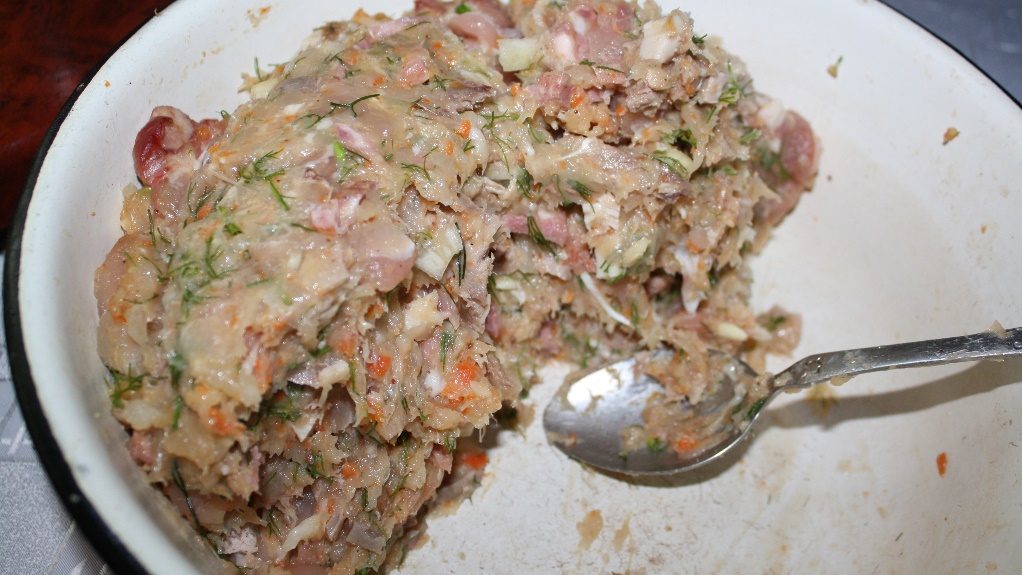 Яйца взбить в пену. В фарш добавить яйца, пряности, рубленый репчатый лук и чеснок, хлебные крошки, вымешать. Фарш поместить в емкость с крышкой и оставить в прохладном месте (холодильнике) на 1,5-2 часа.