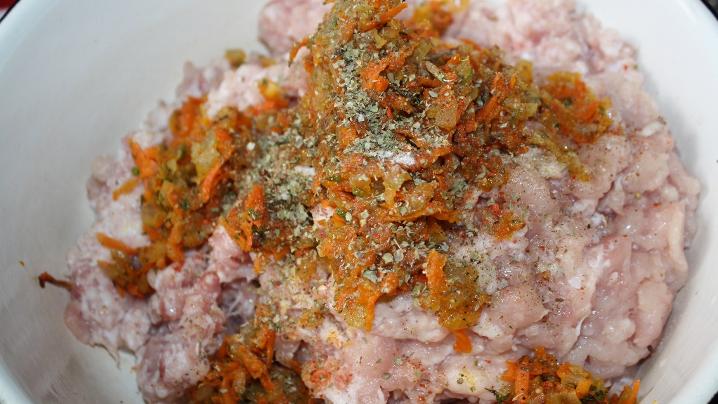 500 гр фарша из куриного мяса, 200-250 мл сливок 10%, 40-50 гр твердого сыра, 30-40 гр репчатого лука, 2-3 зубчика чеснока, 2 столовые ложки белых хлебных крошек, 2 яйца среднего размера или 1 маленькое, по щепотке перца чили, паприки, сушеного имбиря, сушеной зелени тимьяна, соль по вкусу (можно без соли).