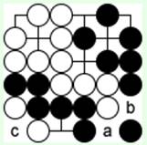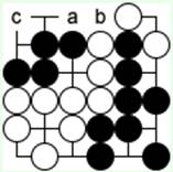 У белой группы два глаза. Черные вверху могут построить два глаза. Белые атакуют нижнюю черную группу ходом 'a', черные пытаются выжить 'b', но белые съедают 'c'.