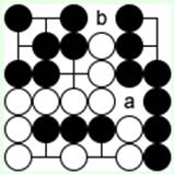 В ответ на слишком агрессивный ход белых 'b' черные разрушают сэки ходом 'a'. Два белых камня внизу гибнут, поэтому черные камни внизу спасаются, и все белые группы обречены.