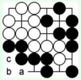 Здесь показано "тройное ко" – один из более сложных циклических процессов. Черные делают атари ходом 'a', белые 'b' и так далее,