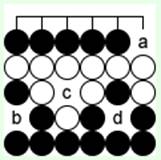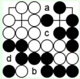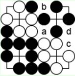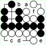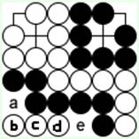 Ходом 'a' они отдают свою "кривую четверку", черные едят 'e', белые вбрасывают 'c', черные ходом 'b' пытаются разгородить глаза, но белые едят 'a', начиная ко-борьбу.