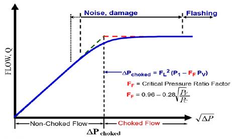 Расход в регулирующей арматуре зависит от давления в местном сужении потока. Поскольку давление в местном сужении потока не может быть меньше, чем Ff умноженное на давление паров жидкости, поток становится дросселированным; то есть дальнейшее снижение давления на выходе не влияет на дальнейшее увеличение расхода.
