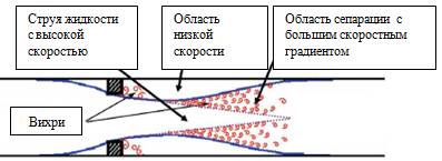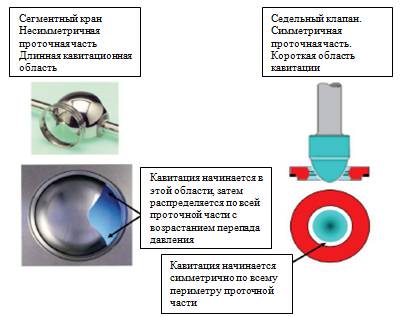 В точках резкого увеличения площади расхода, линии потока, которые привязаны к физическим границам арматуры могут разделяться, и когда это происходит, они образуют вихри. Скорость вращения в вихрях может быть достаточно высокой, чтобы местное давление внутри вихря упало ниже давления пара, и образовались пузырьки пара. Как только скорость вращения вихря уменьшается, давление, окружающее пузырьки пара увеличиваются, и пузырьки лопаются. Вихри также образуются в слое сдвига, прилегающего к основной линии потока, где существуют высокоскоростные градиенты, и они также являются потенциальными источниками для кавитации. Этот уровень кавитации имеет потенциал индикации для определения генерации шума и повреждений даже до того, как кривая расхода начинает отклоняться от прямой.